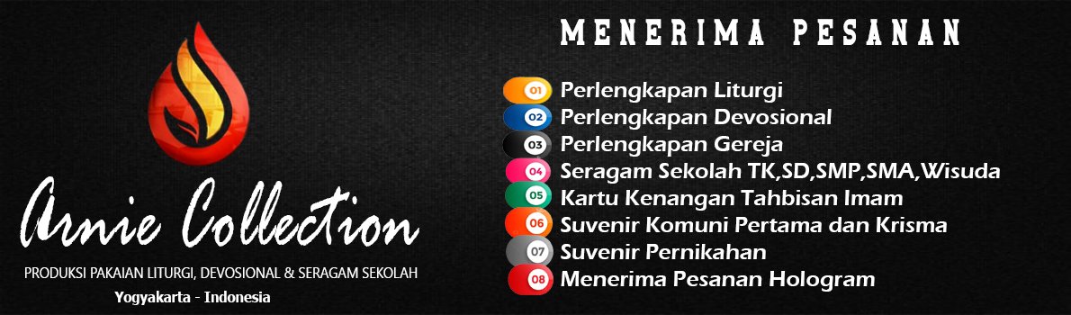ARNIE COLLECTION MERUPAKAN PUSAT PRODUKSI PAKAIAN LITURGI, DEVOSIONAL DAN SERAGAM SEKOLAH (TK,SD,SMP,SMA,WISUDA). TOKO ARNIE COLLECTION JUGA MELAYANI PESANAN KHUSUS BERUPA PERLENGKAPAN INTERIOR GEREJA KATOLIK, PATUNG ROHANI UKURAN BESAR, BUKU-BUKU MISA, BAJU KAOS ROHANI DAN STIKER KACA GEREJA ONE VISION. JIKA ADA KENDALA DALAM MENCARI PRODUK DI WEBSITE KAMI, SILAKAN HUBUNGI CUSTOMER SERVICE MELALUI SAMBUNGAN WHASTAPP YANG TERSEDIA DI KOLOM WEBSITE.